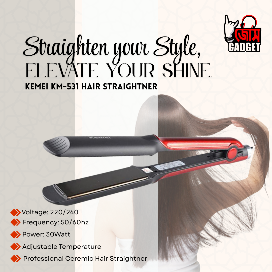 Kemei KM-531 হেয়ার স্ট্রেইটনারটি ঘরে বসেই পার্লারের মতো সিল্কি ও স্মুথ স্ট্রেইট হেয়ার তৈরি করতে সহায়তা করে। উন্নত প্রযুক্তি ও ব্যবহার-বান্ধব ডিজাইনের ফলে এটি দ্রুত গরম হয় এবং সহজেই ব্যবহারযোগ্য।