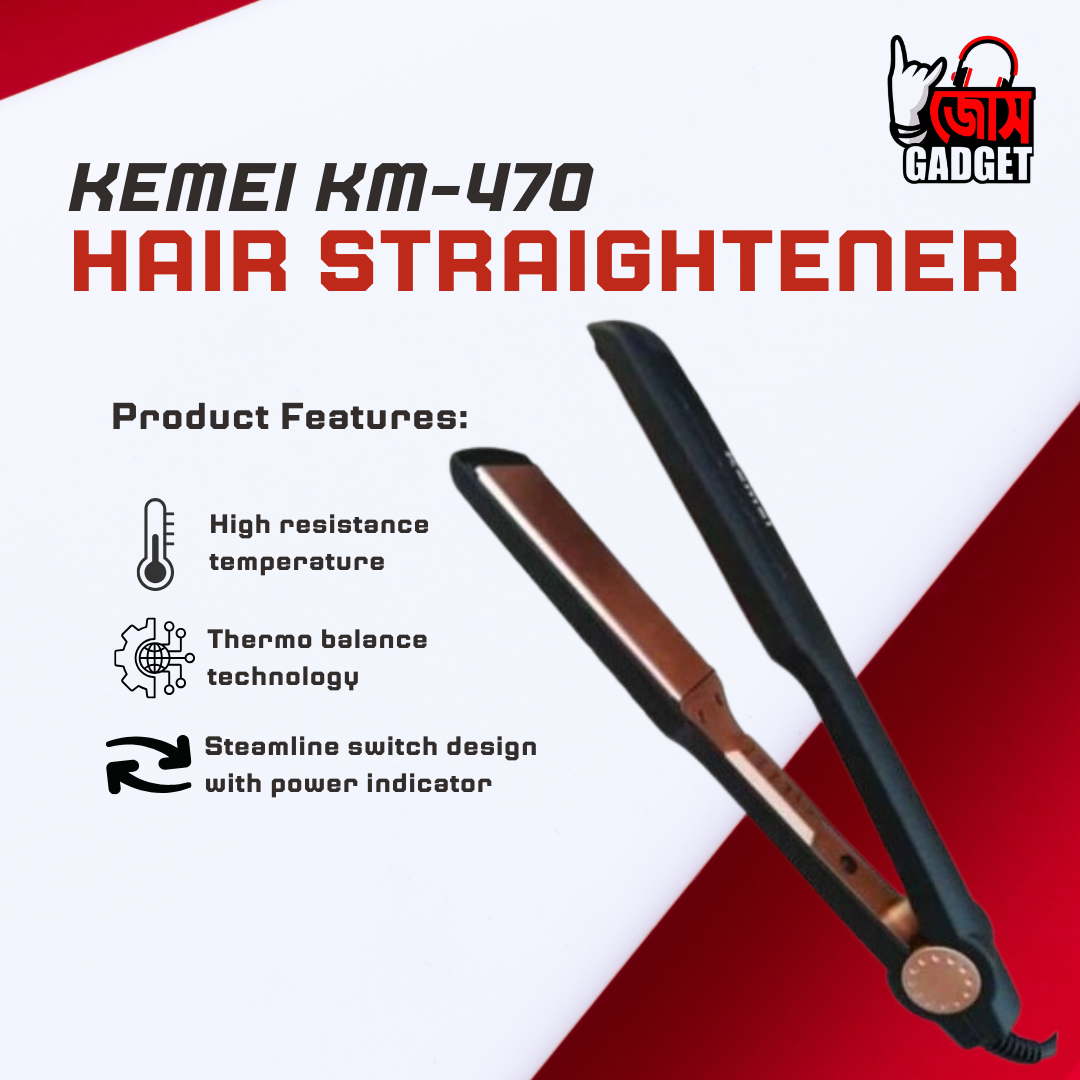 Kemei KM-470 একটি প্রফেশনাল গ্রেডের হেয়ার স্ট্রেইটনার, যা আপনাকে সহজে ও দ্রুত চুল স্ট্রেইট করতে সাহায্য করে। এর উন্নত প্রযুক্তি ও ব্যবহার-বান্ধব ডিজাইন প্রতিদিনের হেয়ার স্টাইলিং-এ এনে দেয় পার্লার-গ্রেডের অভিজ্ঞতা।